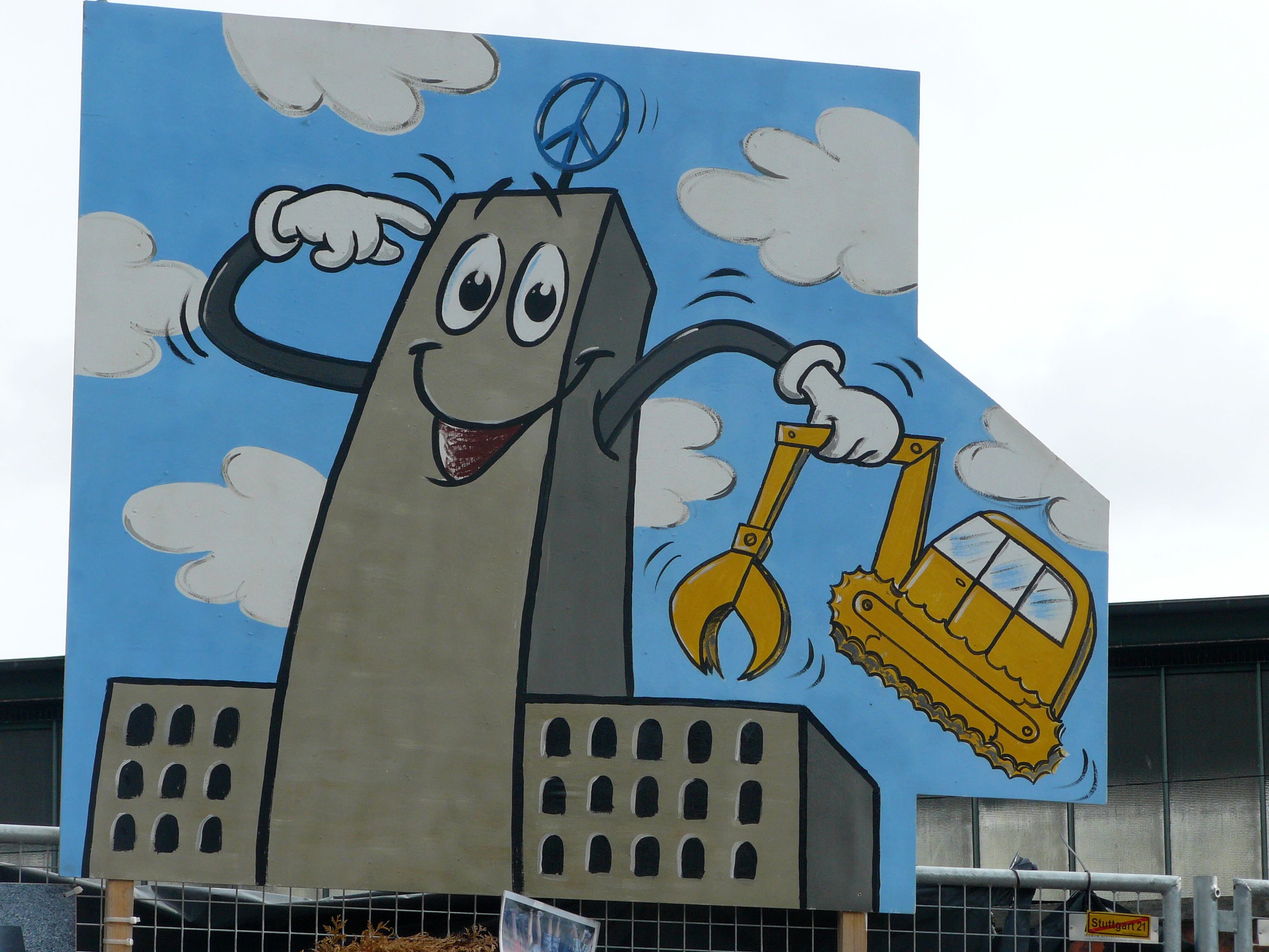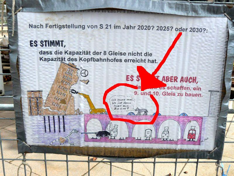Die Männer vertrieben sich derweil die Zeit am Bauzaun des gestutzten Nordflügels. Der Zaun mutiert zu einer Sehenswürdigkeit mit zahllosen, teils originellen, teils künstlerisch wertvollen Äußerungen zum Projekt Stuttgart 21. Gleich, ob man nun für »Drunter« oder »Drüber« ist — eine Sehens-Würdigkeit im Wortsinn.