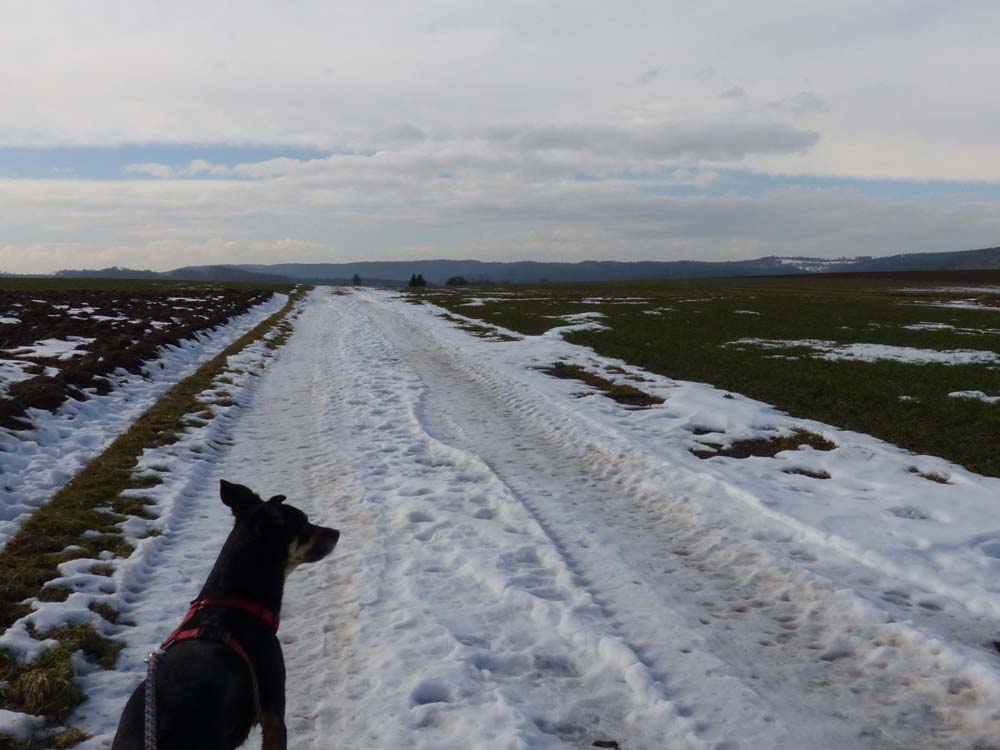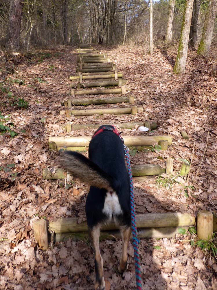 Auch egal. Doch leider hatten Pferdehufen und Forstpanzer die Wege „oben“ so massiv umgegraben, dass sie unpassierbar waren und wir auf wirren Pfaden wieder absteigen mussten. So fanden wir uns eine 3/4 Stunde, 2 dreckige Stiefel und 4 verschlammte Pfoten später wieder unweit des unteren Endes der Himmelsleiter.