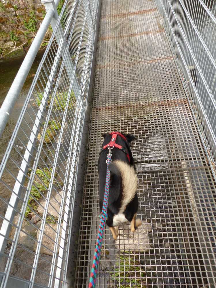 Überraschung eins: Der Weg über’s Wasser führte über einen Gitterrost, Erinnerungen an den Neckarweg wurden wach. Ich wappnete mich fürs Hunde-Tragen — zum Glück nur ein paar Meter und nicht 150 wie damals über die Staustufe Rockenau.