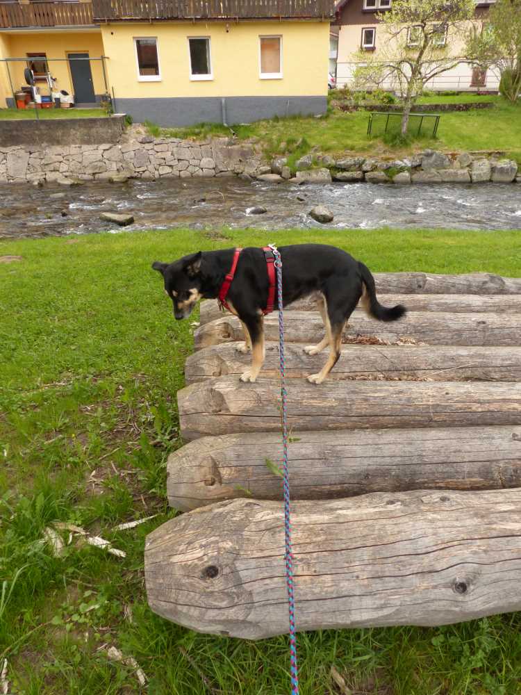 Überraschung zwei: Luis machte keine Anstalten, vom Gitterrost beeindruckt zu sein. Heldenhaft stapfte er über das tosende Wasser unter seinen Pfoten. Erst kurz vor dem Ende des Wehrs fiel ihm ein, dass das/er „gar nicht gehen könne“ — aber da war es zu spät und die letzten Meter schnell ans rettende Ufer gehüpft.