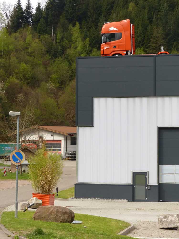 Zurück auf dem Flößerpfad, führte uns dieser am Bahnhof vorbei, durch ein weiteres Industriegebiet und aus Schenkenzell hinaus. Immerhin konnten wir hier einen ungewöhnlich geparktes Zugfahrzeug bestaunen.