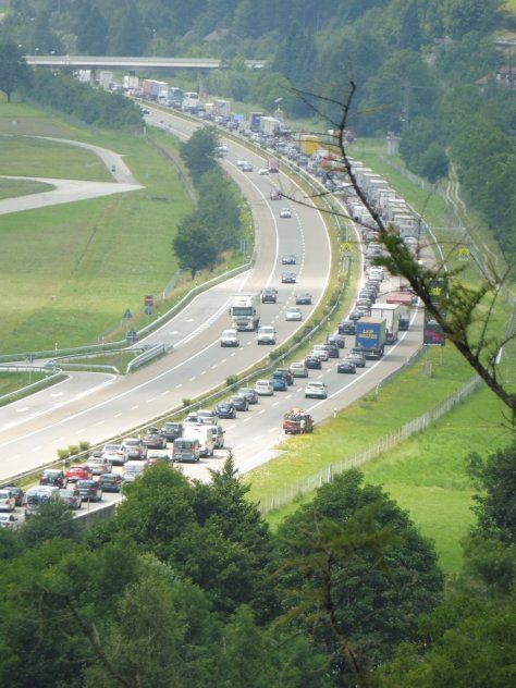 Auf eben jener Autobahn ging es kaum schneller als zu Fuß/Pfote auf der Via Gottardo: Ein ewig langer Stau zog sich Richtung Norden.