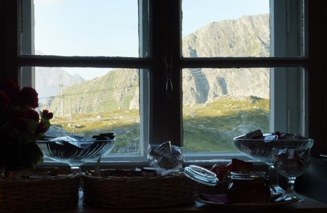 Der Tag begann perfekt mit einem perfekten Frühstück: Frisch gebackener Hefezopf, noch ofenwarmes Brot, intensiver Alpkäse, schöne Salami, frisch zubereitetes Bircher-Müesli und Blick auf die morgenrote Bergkulisse…