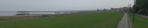 Hier, im hohen Norden, geht eine Seebrücke ein Stück in die See und hört dann einfach auf. Das erinnert an sinnfreie Eh-da-Brücken gescheiterter Straßenbauprojekte oder Kunstwerke, wie ich sie zweimal am Neckarweg bestaunen konnte (>> Fellbacher Landungsbrücke und dto. >> kurz vor Ladenburg).