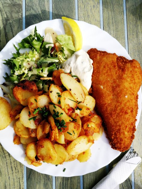 Ja, sind sie! Deshalb konnten wir vor Ort für den anstrengenden Rückweg stärken. Mit Abschiedsscholle mit Abschiedsbratkartoffeln.