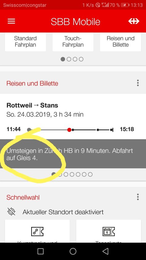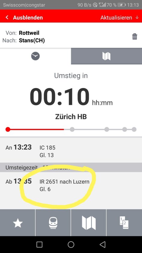 In Zürich durfte ich eine kontroverse Diskussion zwischen DB- und SBB-App verfolgen: „Nach Luzern ab Gleis 6“, behauptete die DB. „Quatsch“, sprach die SBB, „Abfahrt auf Gleis 4.“