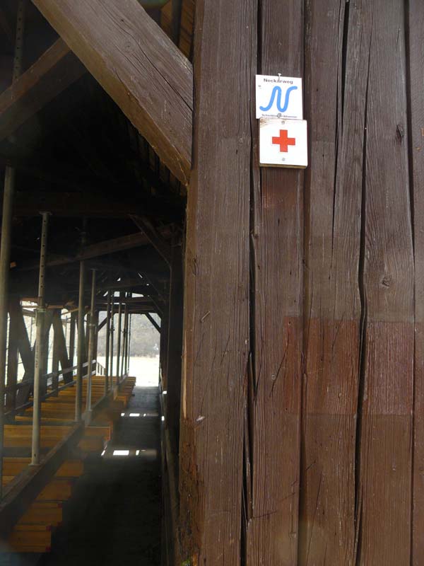Ab hier würde ich über eine schöne, holzgedeckte Brücke auf die andere Neckarseite wechseln und auf lauschigen Pfaden zurück Richtung Rottweil gehen. Pfade und Brücke kannte ich bereits von der 3. Etappe des Neckarwegs (» Neckarweg III: Rottweil — Epfendorf).
