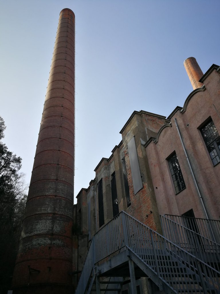 Und im Augenwinkel glaube ich kurz, doppelt zu sehen. Ein weißes Duplikat des Schornsteins? Nein, der Aufzug-Testturm von » Helmut Jahn, der genau aus diesem Blickwinkel fast gleich groß und dick aussieht. Ziemlich genau 100 Jahre liegen zwischen den Entwürfen — und jetzt stehen die Werke zweier Star-Architekten scheinbar wie zweieiige Zwillinge nebeneinander.