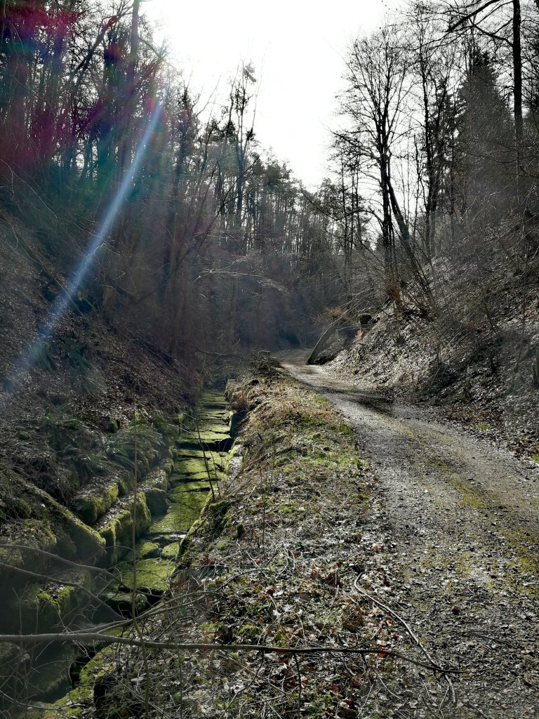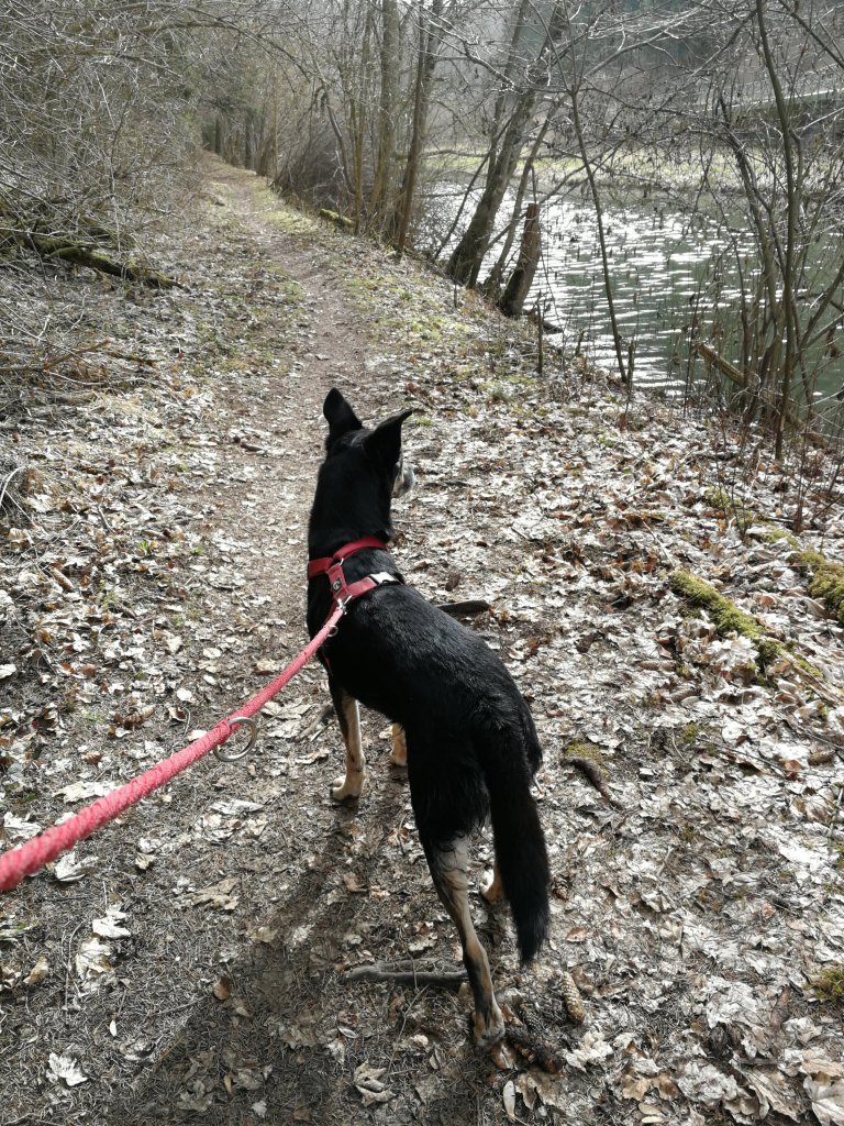 Der als „etwa kniehoch“ beschriebene Luis war komplett nass, meine Füße (nach schwäbischer Definition) auch. Mangels Handtücher und Sonne beschloss ich, aus dem Uferpfad einen Barfußpfad zu machen, um meine Gehwerkzeuge trocken zu gehen. Das funktionierte überraschend gut und nach dem eiskalten Neckarwasser (wir haben Ende Februar!!!) fühlte sich der waldige Weg fast angenehm warm an.