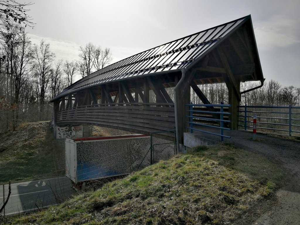 Die nächsten 2 Kilometer waren eher unattraktives — Wohngebietswandern und Straßenbegleiten. Gut, dass ich die umgekehrte Richtung gewählt hatte und dieser Abschnitt nicht der abschließende Eindruck der Tour war. Mit der Überquerung der B27 fing dann richtige Landschaft an. Und ich bin endlich mal über die Holzbrücke gegangen, unter der ich so oft durchgefahren bin und mich gefragt habe, ob ich da mal drüber gehen würde ;-).