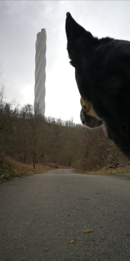 Ich war ja nicht zum erstem Mal hier — aber zum ersten Mal seit dem Bau des Testturms. Es sieht schon sehr beeindruckend aus, wie der sich neben dem Taleinschnitt in den Himmel bohrt.
